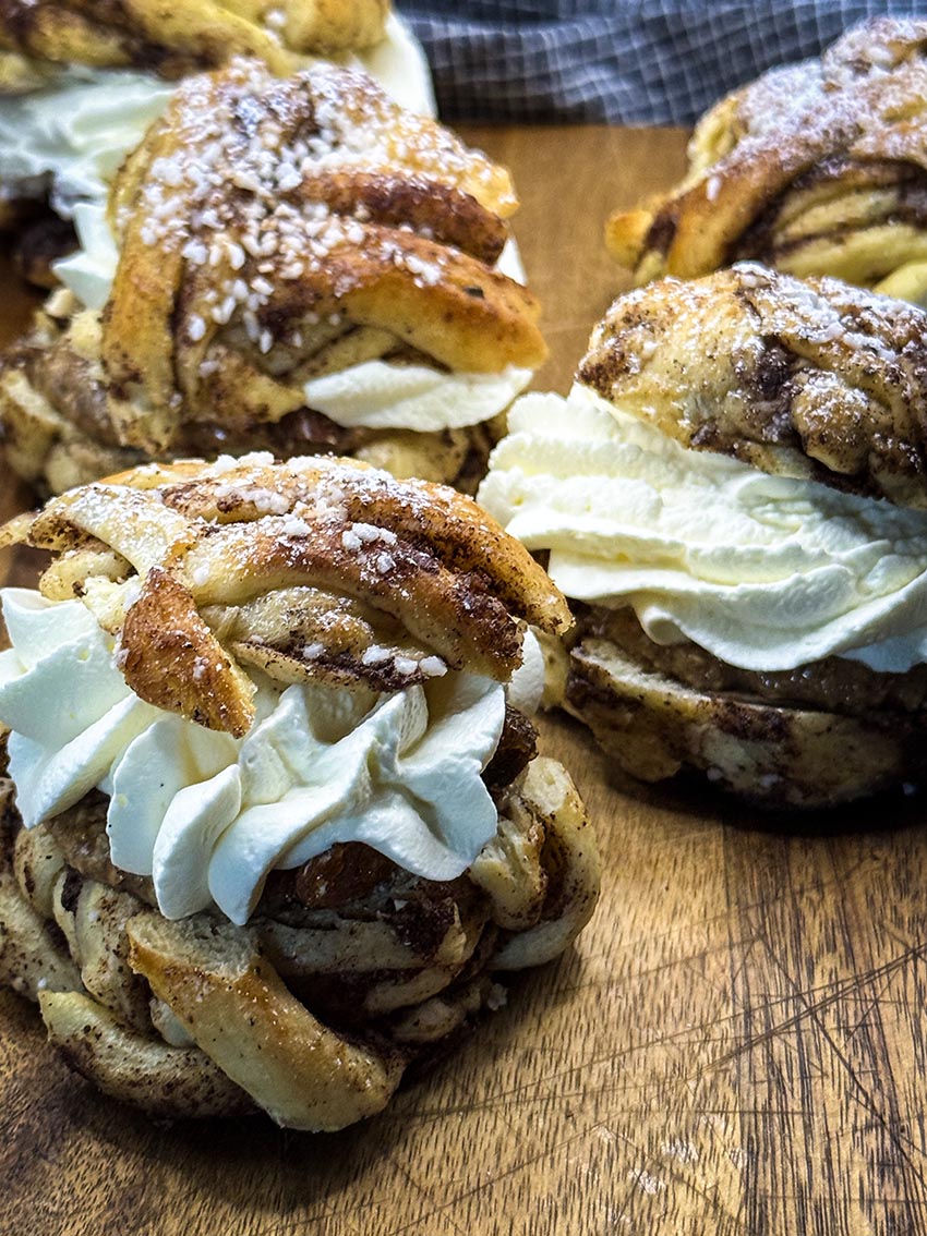 Denna smakupplevelse är något utöver det vanliga! En härligt saftig kanelbulle med mycket kanelsmak och som smälter i munnen, kombinerad med egen, hemgjord mandelmassa som varsamt rostats för att framhäva den rika, nötiga smaken. Tillsätt en generös klick vaniljgrädde och du har en oslagbar smakkombo som lyfter varje tugga till nya höjder. Det är den perfekta blandningen av sötma, krämighet och den subtila rostad mandelsmaken – en riktigt lyxig fika som inte går att motstå!